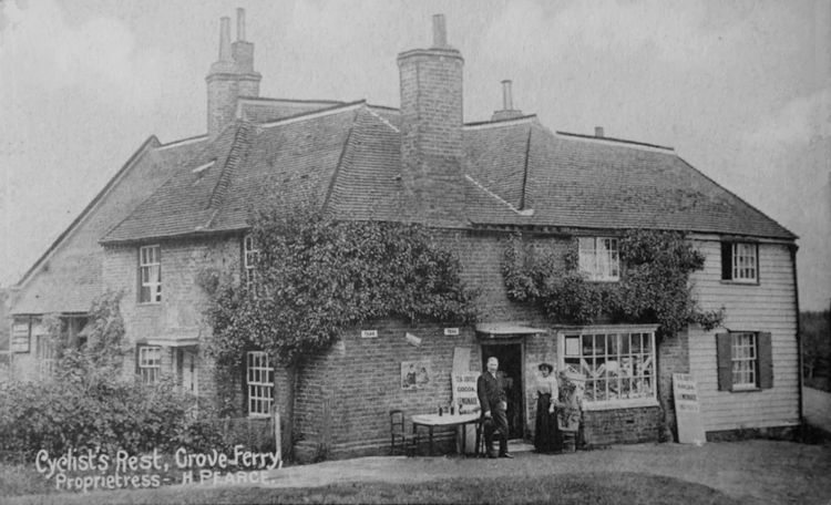 As far as I can determine, the "Cyclist's Rest" was an Edwardian stopping-off point and watering hole for cyclists, who fancied a spot of lunch, washed down with a bottle of beer, or perhaps even something non-alcoholic. Very little else known at this stage, other than the fact that (like many recreational businesses) the premises closed down for the duration of WW1 and then appears not to have re-opened. The "Cyclist's Rest" traded from a building, not in Grove Ferry but on the corner of Island Road and Nethergong Hill, Upstreet.