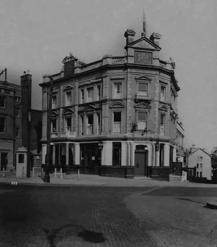 I have also seen this addressed as Upper Norward, which is not in Kent. It is actually on the corner of Crystal Palace Parade and the corner of Upper Norward. The founders of the "White Swan" in Westow Hill were lucky enough to acquire what was soon to be a prime site and the Crystal Palace was thought of. After 1854 the pub quickly grew from a humble beer-shop to the large shown in this 1883 photograph. In 1884 it was rebuilt on three floors. Its decline has also followed the Crystal Palace. The third storey as removed in the 1960s, although I have been told this happened after it was damaged in WWII. The garishly painted fragment is now called Bluebottle. It changed name to the "Westow House" as yet date unknown.