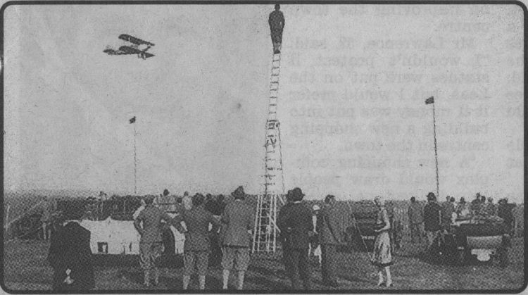 of a giant step-ladder to judge the take-off height of a biplane in 1926.