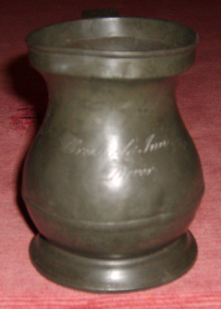 Above is shown a Pewter Mug engraved with the words, "Brussels Inn,