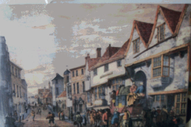 I do not know how old this pub is and obviously predates the painting of 1827, but in 1828 the pub was demolished to make way for the Regency Church. The yellow-brick building was closed in 1902 when the parish amalgamated with that of St. Alphage, but the building was used as a hall till about 1935 when that was also demolished. The premises is now the site of the Canterbury library. I am assuming that this was a pub, but further research has listed the building as Coach and Waggon Offices.
