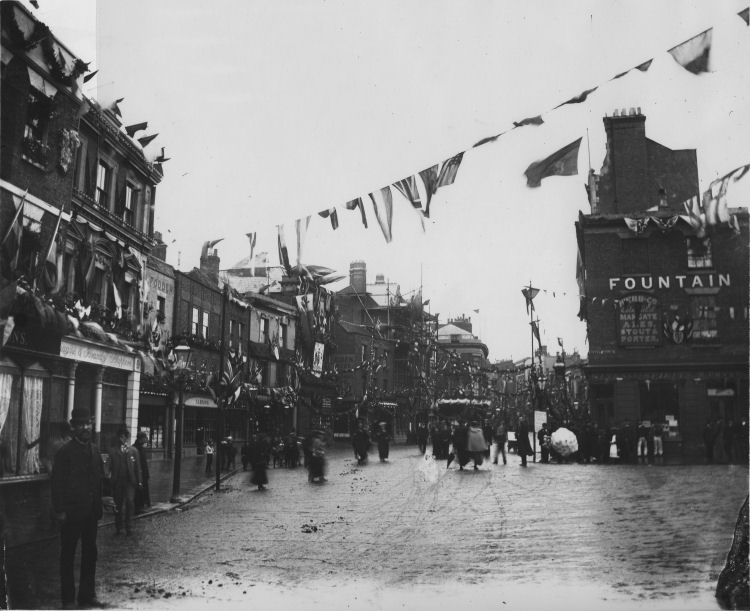 Westminster Bank. On the corner is the old Fountain Hotel, the site of