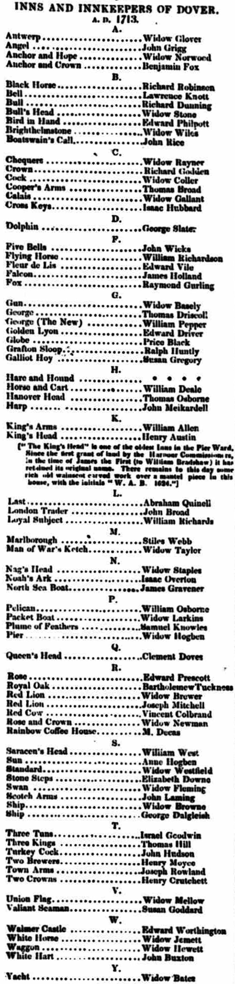 The Dover Chronicles on 7 May 1842, printed a list of "Inns & Innkeepers