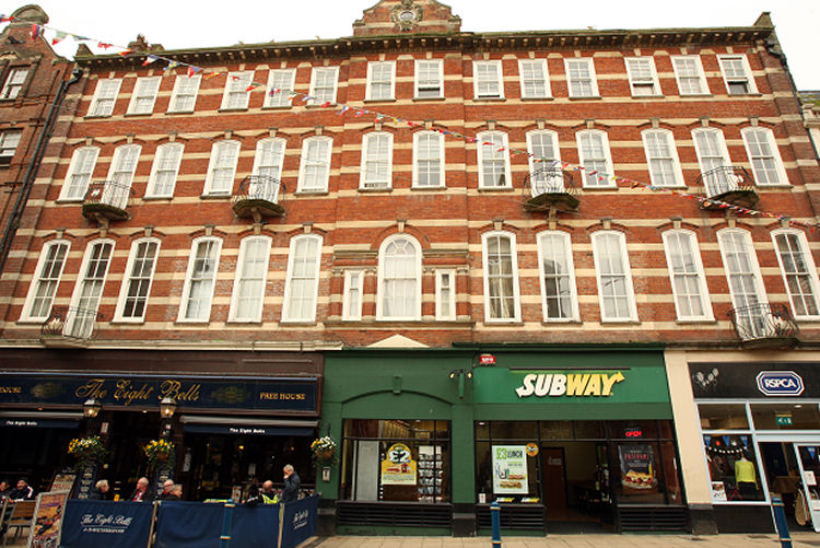 The ground floor is used as a pub, the "Eight Bells", and shops, but these