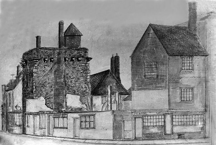 This is titled, St Nicholas Tower (left) and Alms Houses (right)