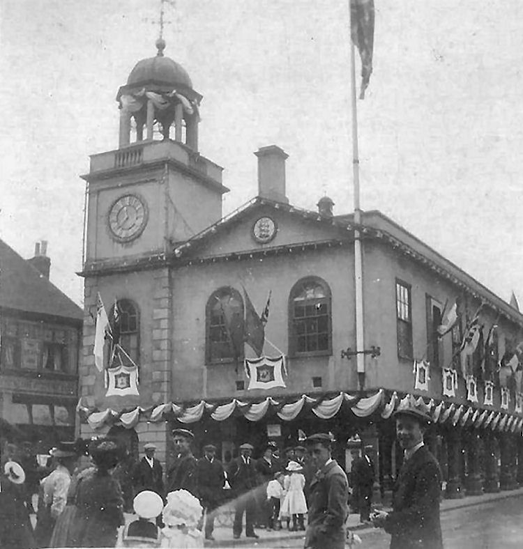 Above print, 1858, showing the Town Hall and Market Place. The "Bear" is