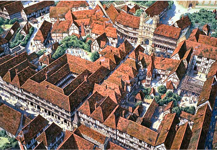 The inn was rebuilt by Christchurch Priory in 1392 by prior Chillenden at a cost of £867.14s.4d., and the building took three years to complete. It occupied almost half the west side of Mercery Lane, and was further extended in 1435 by the purchase of the "Crown Inn" next door. The ground floor housed workshops with shop fronts with storage provided in the basement. On the first floor was the Chamber of the Hundred Beds, and the inn courtyard had a staircase which allowed access to it. The inn itself had first floor suites with an external gallery overlooking the courtyard for wealthy pilgrims and second floor dormitory under the rafters of the roof for up to 100 less wealthy pilgrims. There was a colonnade in Mercery Lane, beneath which travelling pedlars sold souvenirs such as ‘Becket Brooches' to pilgrims. This was removed during the Commonwealth and the shops on either side of the road brought forward, creating the narrow thoroughfare of today. The unusual name has two possible sources. The first is from the board game played at the inn on tables made of ale or beer barrels (or tuns) stood on their ends which were held together by hoops (or hopes) of iron. The second is from the Cheker building, a counting house in the Priory, referring to the counting of hopes that pilgrims felt for their visit to the shrine. The Inn is referred to in Geoffrey Chaucer's “The Tale of Beryn” as the resting place of the pilgrims whose stories are told in the Canterbury Tales. Another fourteenth century writer tells us that:- "When all this merry fellowship were come to Canterbury, They took ther in and lodged them at mydmorowe I trow, At Checker Of The Hope that manie a man doth know.'