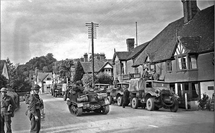 up outside the Chequers, with a well-loaded Bren Gun Carrier passing