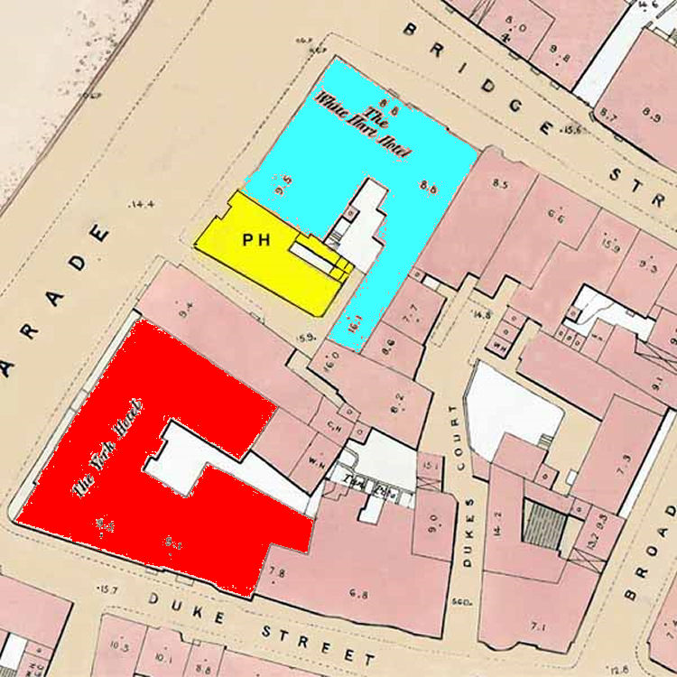 YELLOW="Lord Nelson. RED="York Hotel" BLUE="White Hart Hotel." O S map 1852.