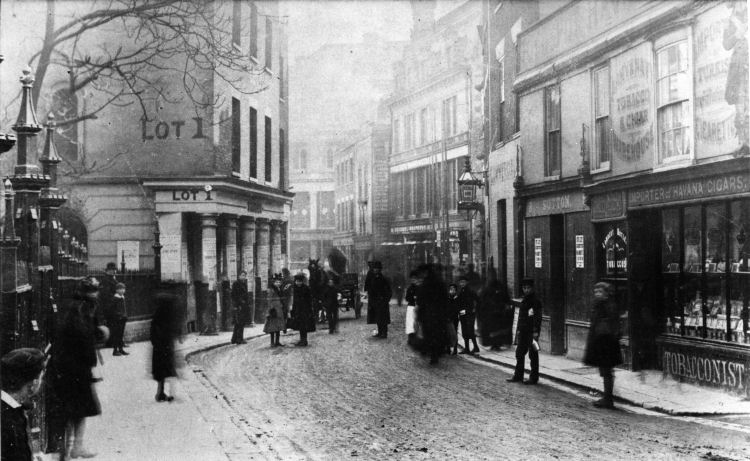 Cannon Street in the 1890's before widening showing Chidwicks, tobacconist,
